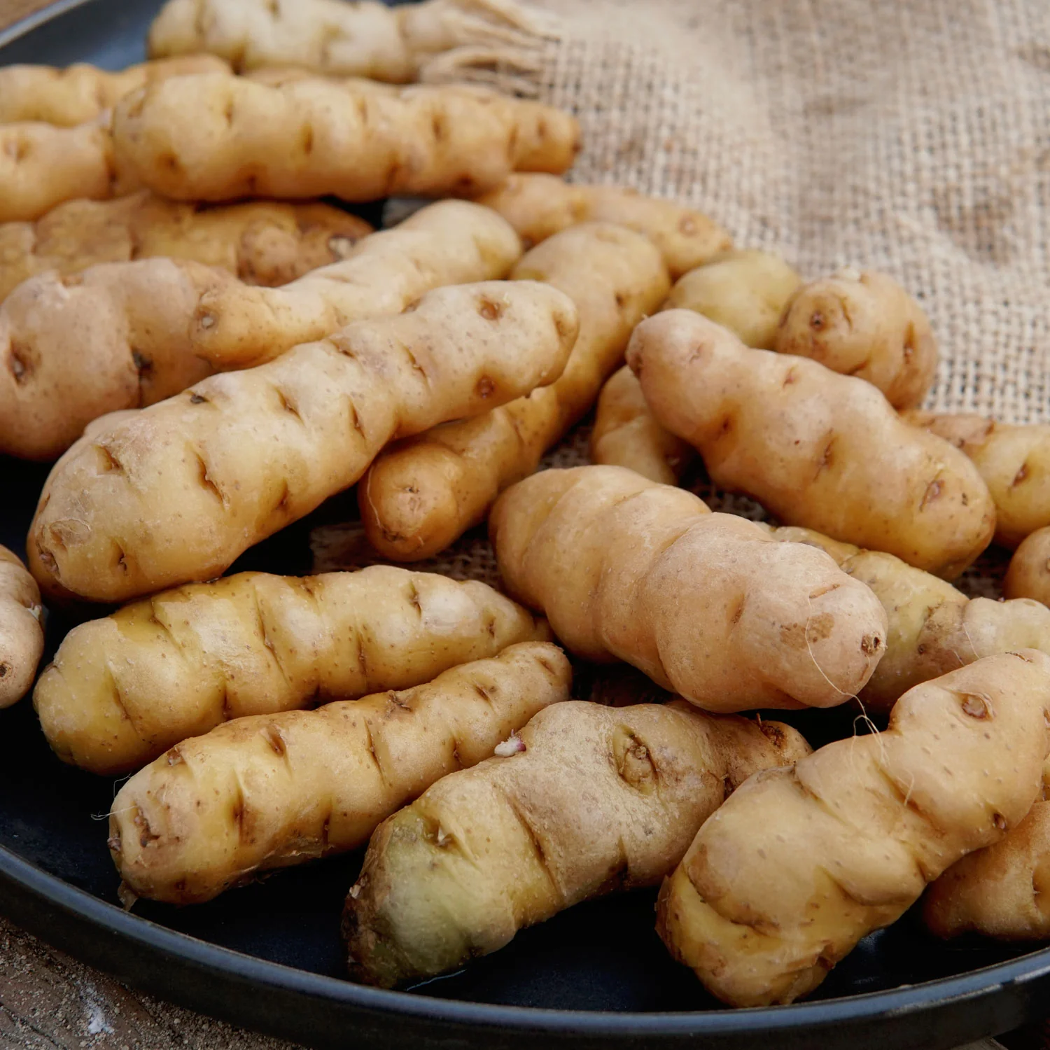 Mid-season 80–90 days. Ozette is an old favorite owned by the Makah Tribe of Washington State. This fingerling potato grows on medium-sized vines that can yield up to 30 tubers per hill, each with buff-colored skin, deep eyes, and off-white flesh. A productive and flavorful variety, it has a nutty, earthy flavor and firm, creamy texture, making it delicious in a wide range of dishes.